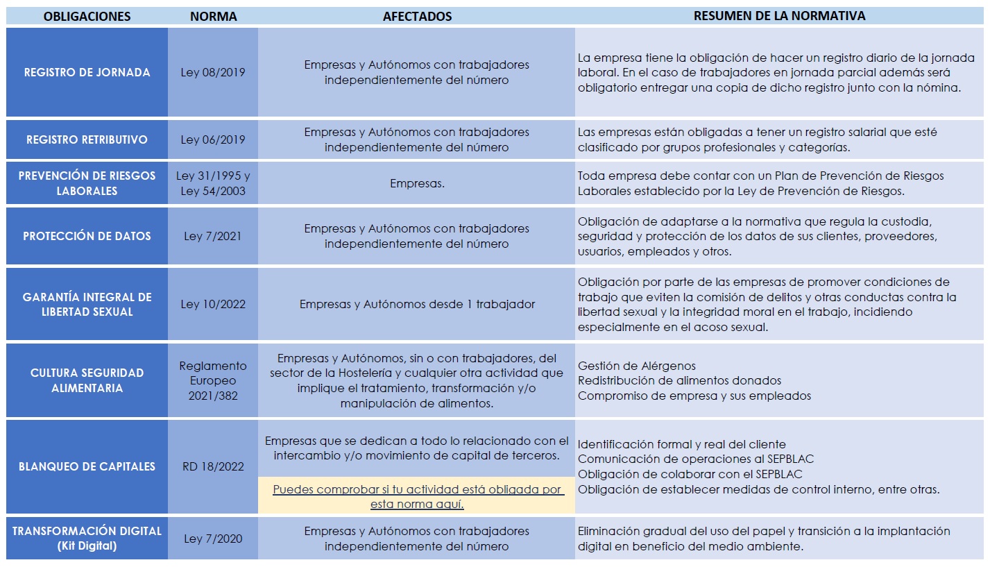 Estas leyes sientan las bases de una serie de aspectos fundamentales y obligatorios en la actividad de las empresas y su incumplimiento puede implicar la aplicación de importantes sanciones.